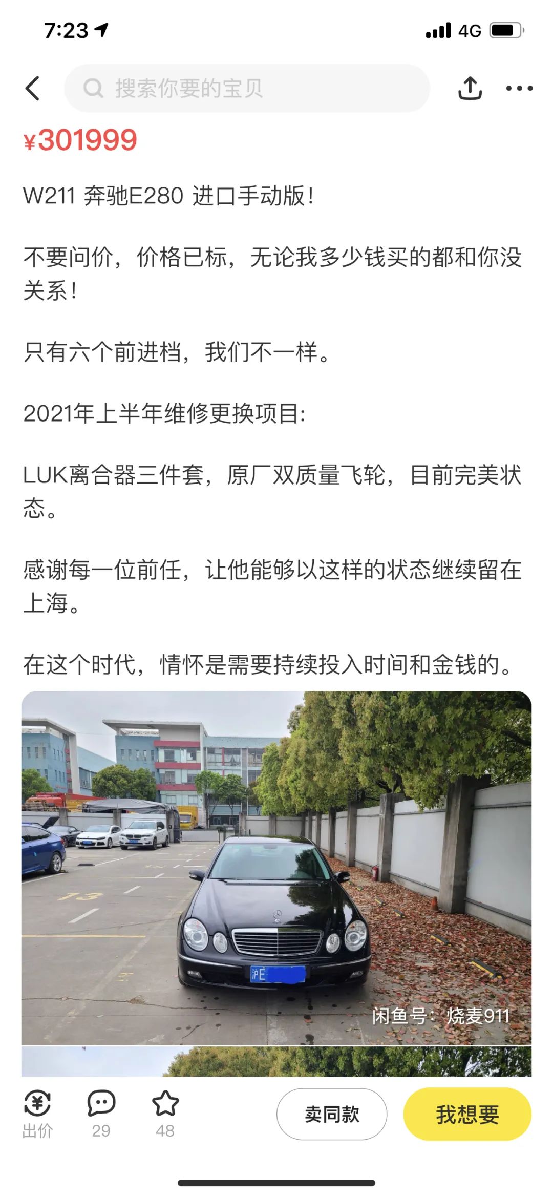上海则有一台使馆带进来的06年手动档E280,是爱车的诺诺那里整备出去的,现在闲鱼挂30W!说是手动档奔驰在国内可能比手动档保时捷还稀有,我不确定。反正手动档保时捷我也有一台,没啥大不了