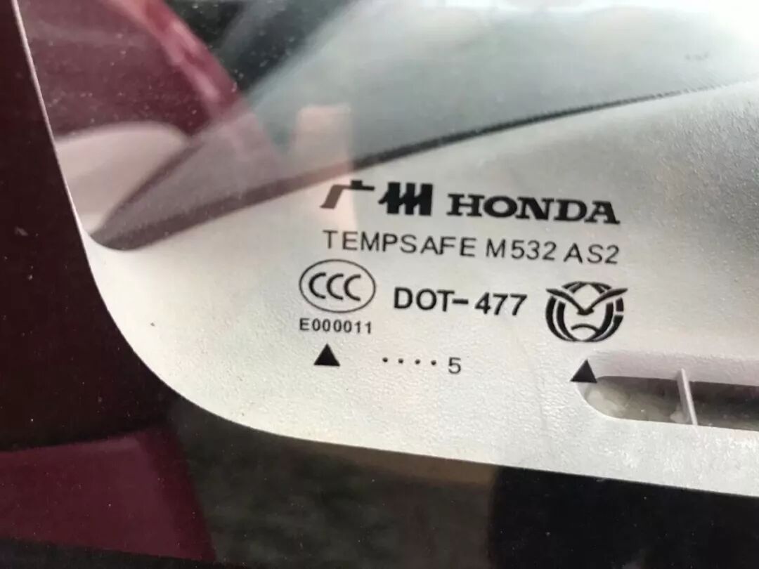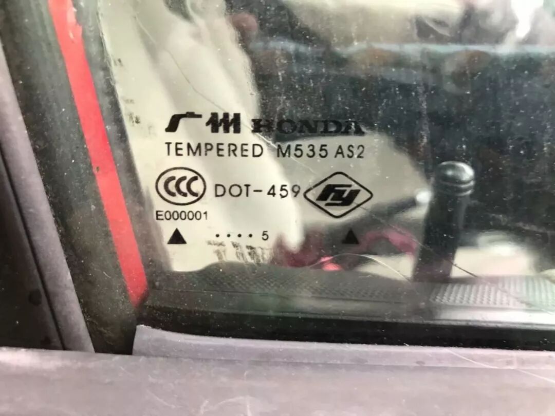 当然,这车除了左前门被撞过,还有就是被追过尾,那个钣金师傅大概是印度阿三水平,“只要能开就行”,后备箱和尾灯之间缝隙贼他妈的大,都可以伸进一根手指了!不过好在所有的车窗玻璃上显示都是2005年生产的,说明这车没被砸过,也没有被撞到过稀巴烂: