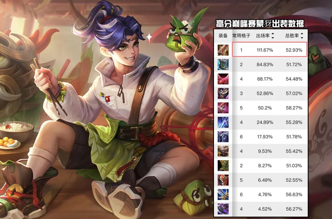本期的蒙犽头像上,大宝备一样标注了2把无尽,原因也是和鲁班一样,高分巅峰赛已经兴起了双无尽蒙犽的玩法。