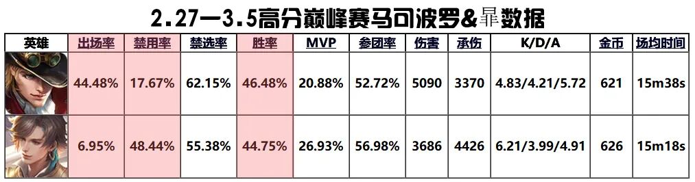 ①马可波罗当前的禁选率(禁用+选取)、胜率和暃都非常相似。虽然暃是禁用率更高,这里也产生一个问题,即便你把暃放出来,也不一定有人选。