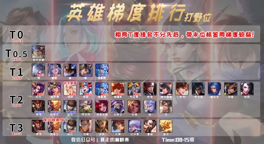 宫本武藏的整体优先级已经超过了其余打野,因此将他上放至T0.5强度,这也是时隔两期后,终于再次有打野英雄突破到T0.5行列。