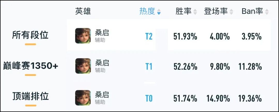 但两相对比之下,我们可以发现调整前的桑启强度无疑是过于超标的——禁选率、胜率双高;平衡调整后虽然胜率下降明显,但其优秀的机制(尤其是体系阵容下能达到1+1>2的效果)仍在,他目前在顶端排位以及巅峰赛1350+也还拥有相当高的热度,因此本期还是给予桑启T0.5的排行。