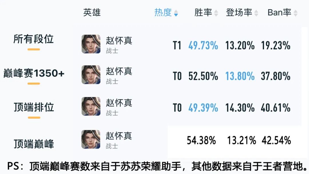 从上图中我们可以看到,赵怀真目前在各分段都已经上了ban位,并且胜率也都是比较高的状态,其中顶端局更是达到了54%,这足以说明他在当前版本的强度!