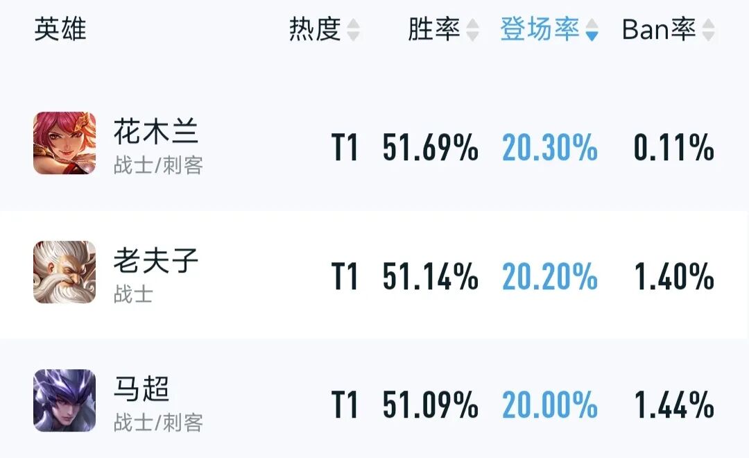 其中,花木兰、老夫子在高星局和巅峰1350中的出场率都下降了4%左右,而马超则是胜率下降了1%。