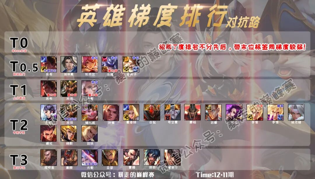 由于对抗路三巨头前前后后都经历过一些调整,整体强度已经有所下滑,所以本期将他们添加上末位标签。而前列英雄强度下降,优先级仅次于他们的吕布,也就会有更多的出场机会。
