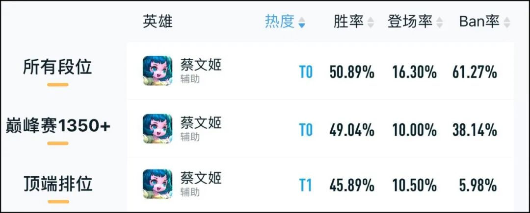 可以看到,经过增强后的蔡文姬胜率对比之前并未发生变化,仍呈现“分段越高,数据越低”的情况。目前她在顶端排位的胜率堪堪接近46%,位列其分段倒数。不过她在三个分段的禁选率都有不同程度的增加,在1350+巅峰赛的禁用率更是在短短几天内增加了10%。