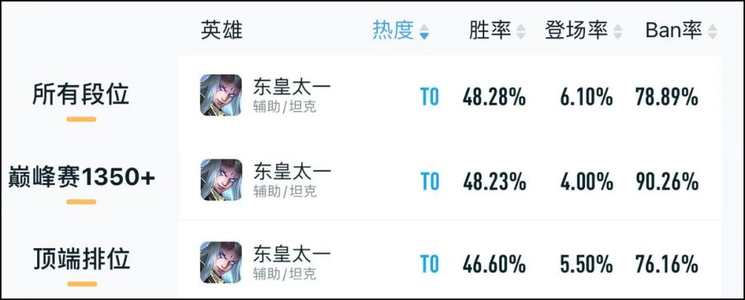 但同时我们也能发现,东皇太一的“超高禁用率”这一问题暂时得到解决,但他仍然是全英雄、全段位中的ban率之最,尤其是在1350+巅峰赛中,仍保持在恐怖的90%上下。