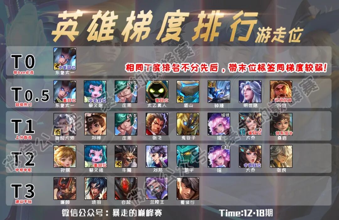 时隔一月,虽然中间有多项相关英雄的调整,但对比上一期来说,本期的游走位T度排行变动并不大:T0的宝座仍由(中低段位的)东皇太一一人独占,仅有桑启从T0.5降到了T1。