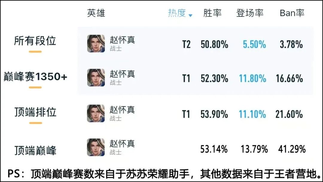 本期将赵怀真中低分段和高分段强度区分,主要原因在于赵怀真调整后,在中低分段的表现较为一般,并且热度、禁用率也都在随着时间逐渐下滑,所以目前先放在T1位置。
