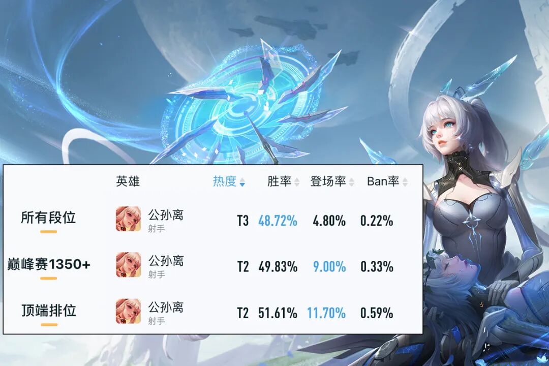 ①从上方三分段数据来看,公孙离还没有显得比较突出,高分段也仅能放在强势射手一列。