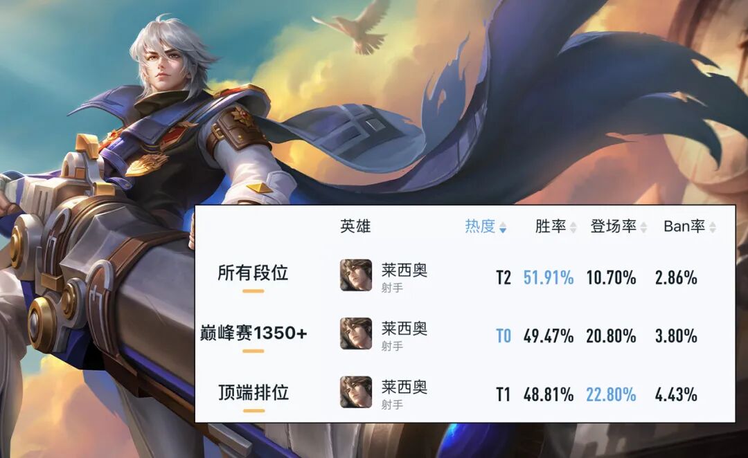 因为削弱的关系,莱西奥各分段出场率降低的同时胜率也在下滑,目前仅有中低分段还在50%左右,其余两分段都已经跌到了胜率倒数的位置。
