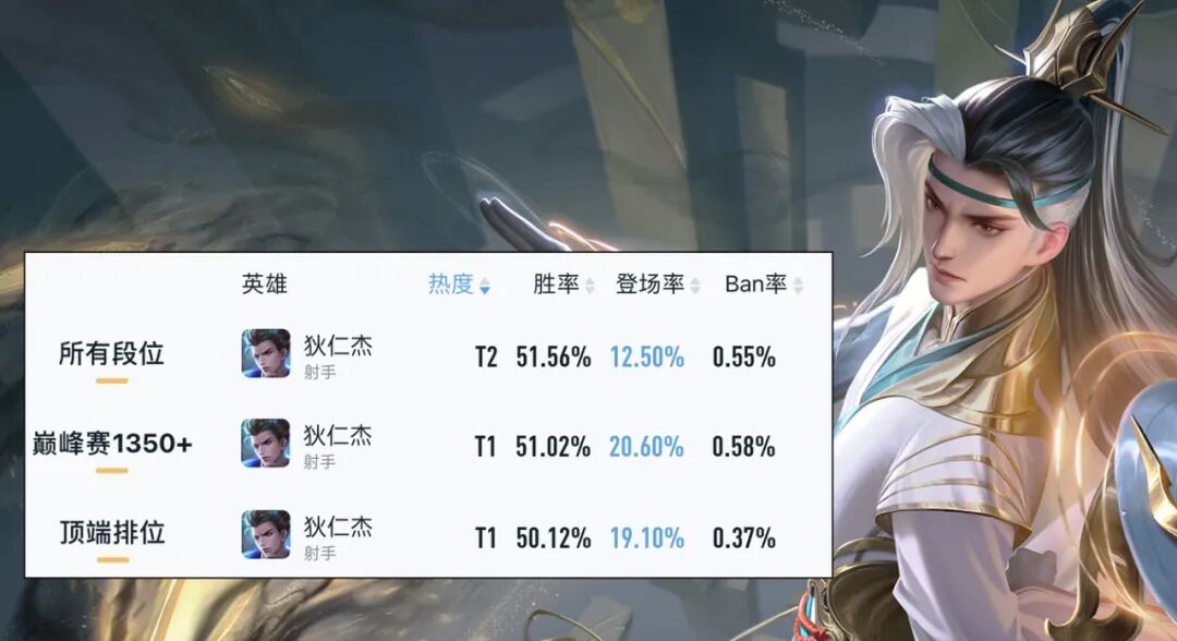 因为上次的调整,让狄仁杰前中期作战能力下滑了些,这也导致他的出场率在那段时间下降了许多。