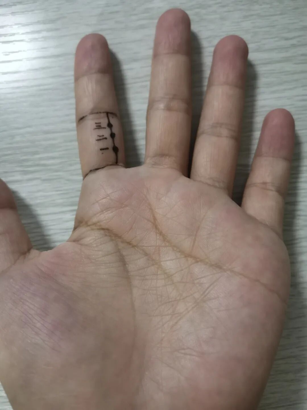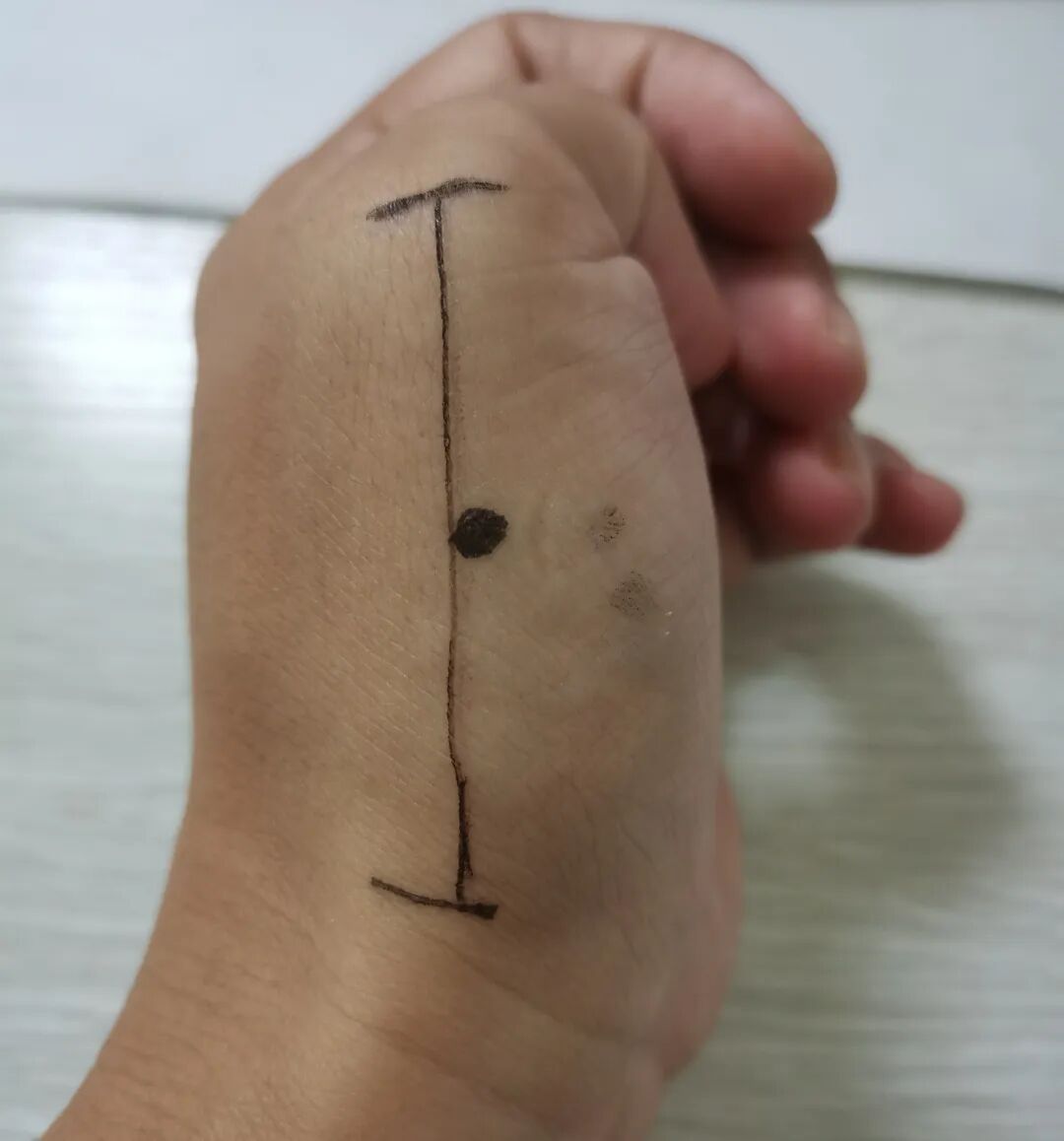 木穴的取穴方法,简单说来,在食指第一节的掌面,靠近小手指那侧,贴着骨头的切线画一条线,把这条线三点四等分,如下图。