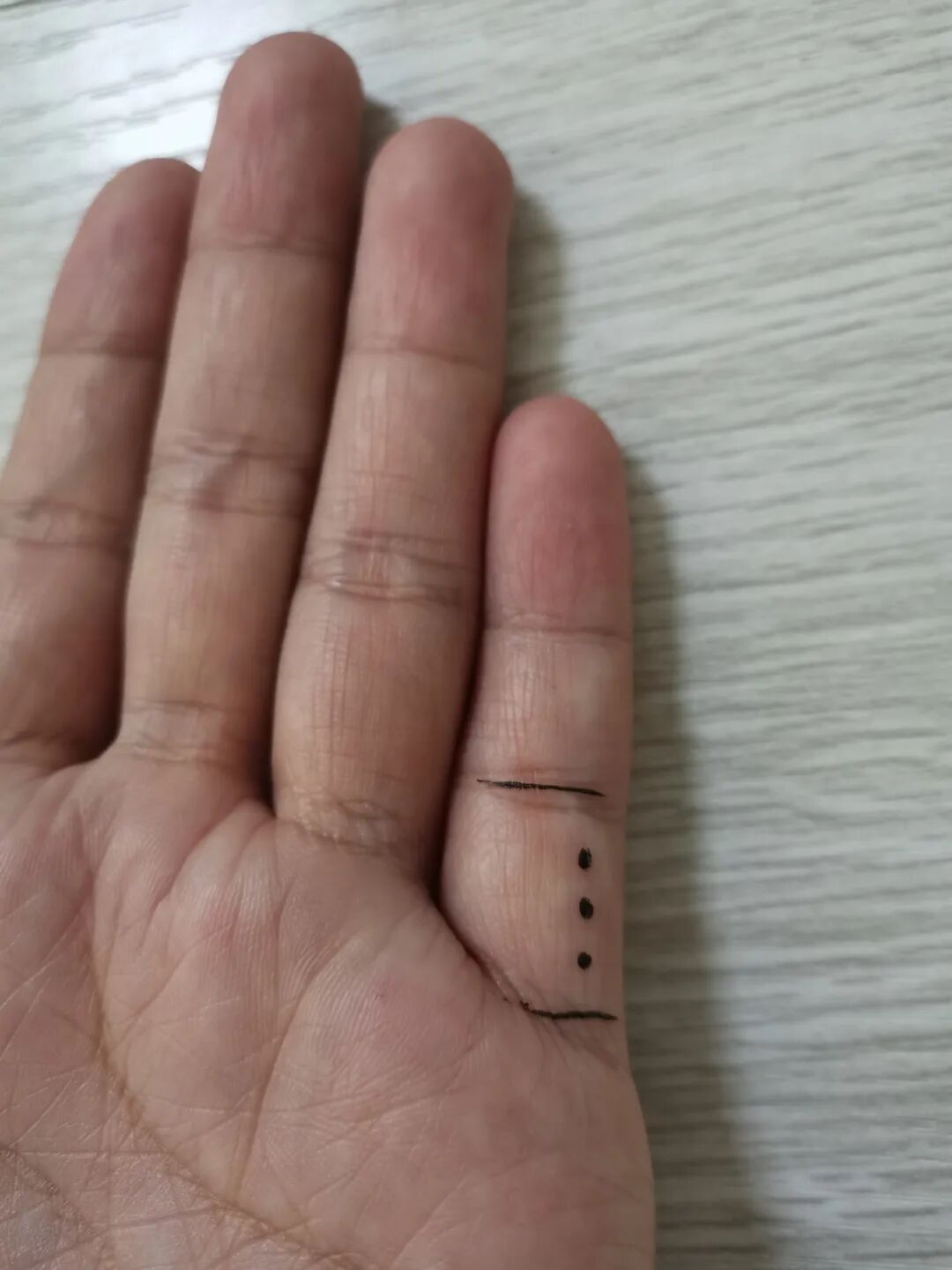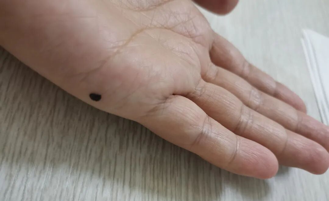 水源一穴,在手掌面,小指第一节中央偏尺侧3分,上两分半处。