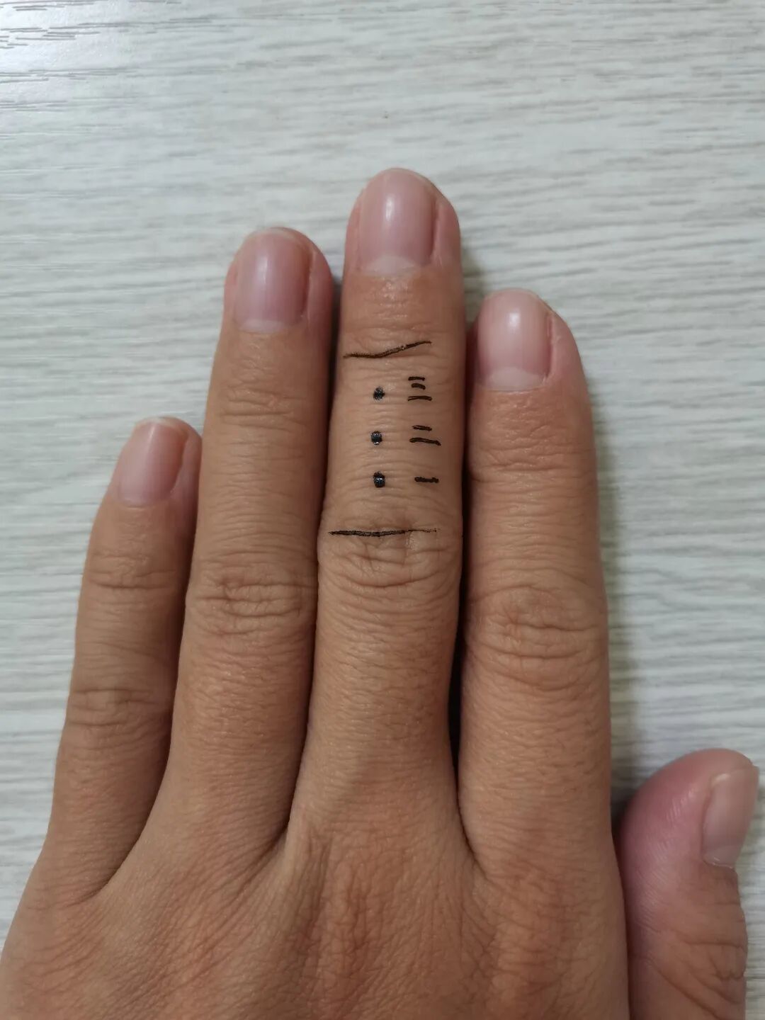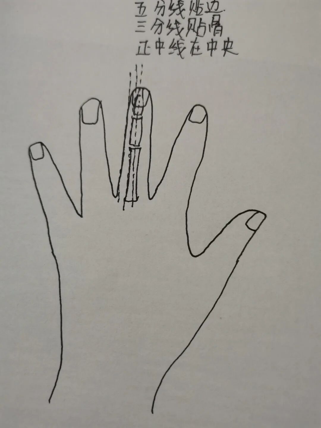 董氏奇穴手指上的三分,五分,并不是尺寸,也不是拇指同身寸,而是把手指的宽度(周长)分成10份,中间为正中线,3分线贴骨,5分线贴边。两分半还是把这个手指节的长度分为3个点,4份。