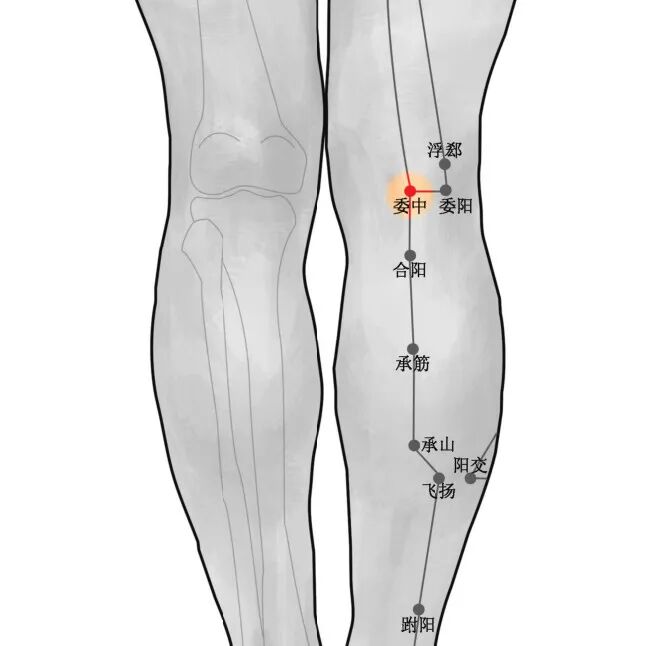 委中,在腘横纹的中点,股二头肌腱和半腱肌肌腱中间。主治腰腿痛。