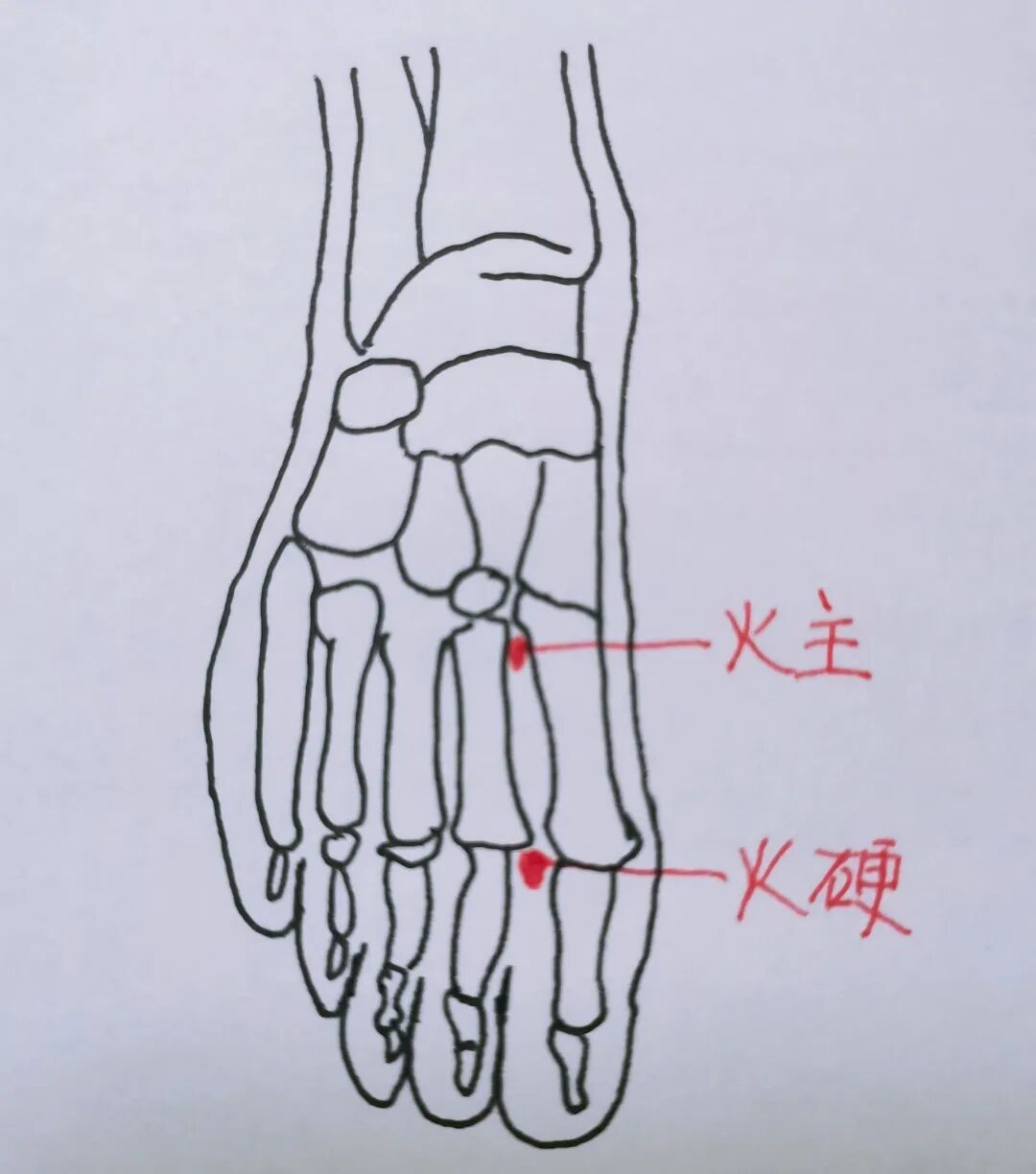 火硬穴,在足背面,第一跖骨和第二跖骨的趾蹼缘上0.5寸。