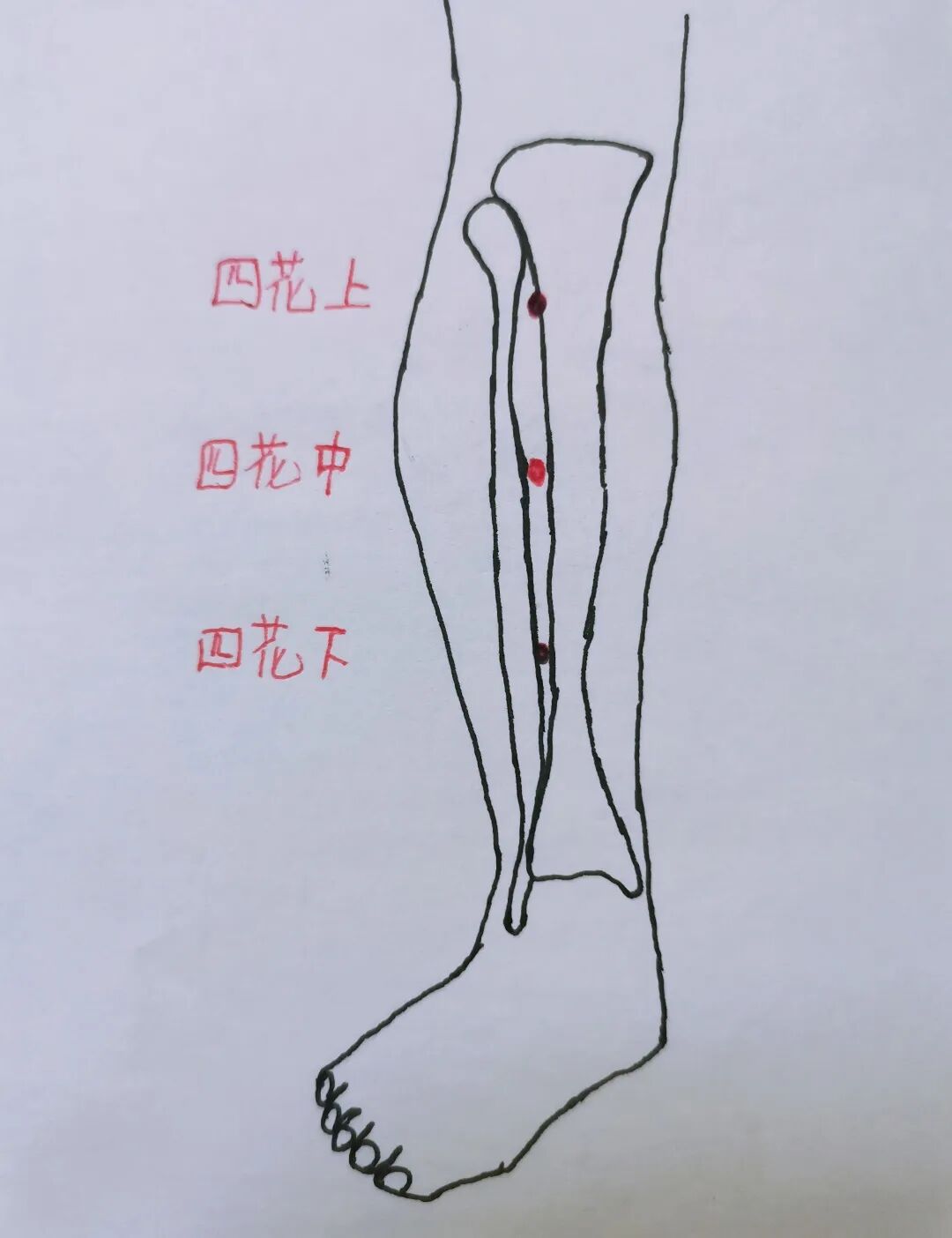 四花中穴,在四花上穴直下4寸。(四花上穴,在传统针灸穴位足三里穴内1寸,紧贴着胫骨。)