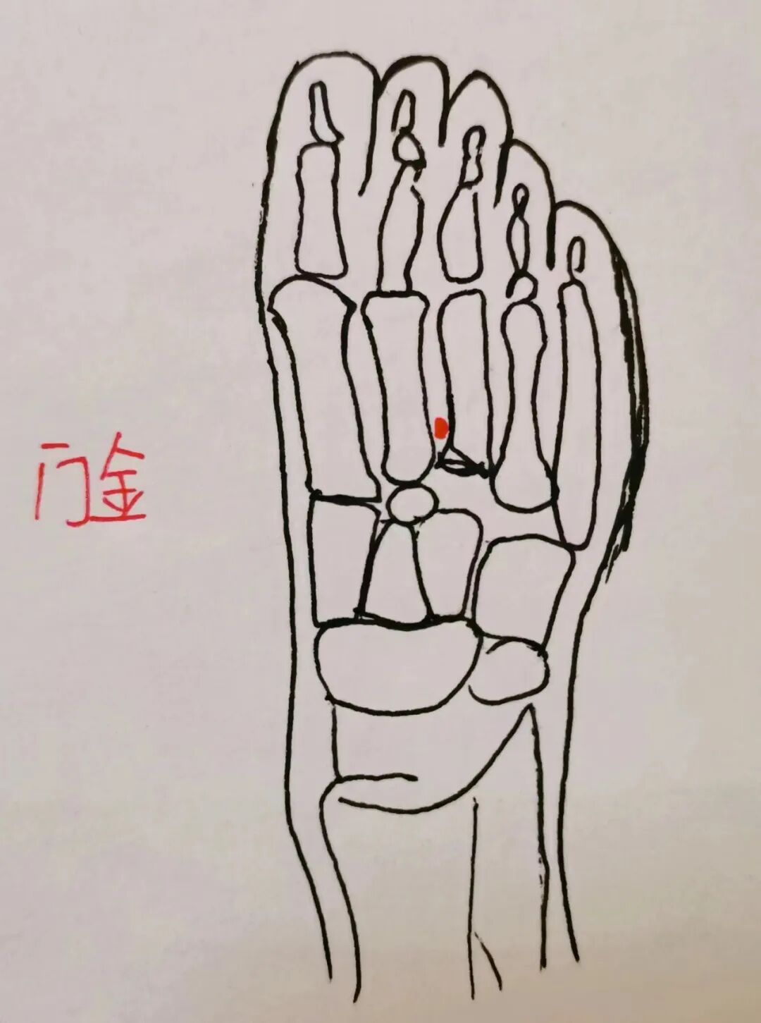 门金穴,在脚背,第二、三跖骨关节连接处。