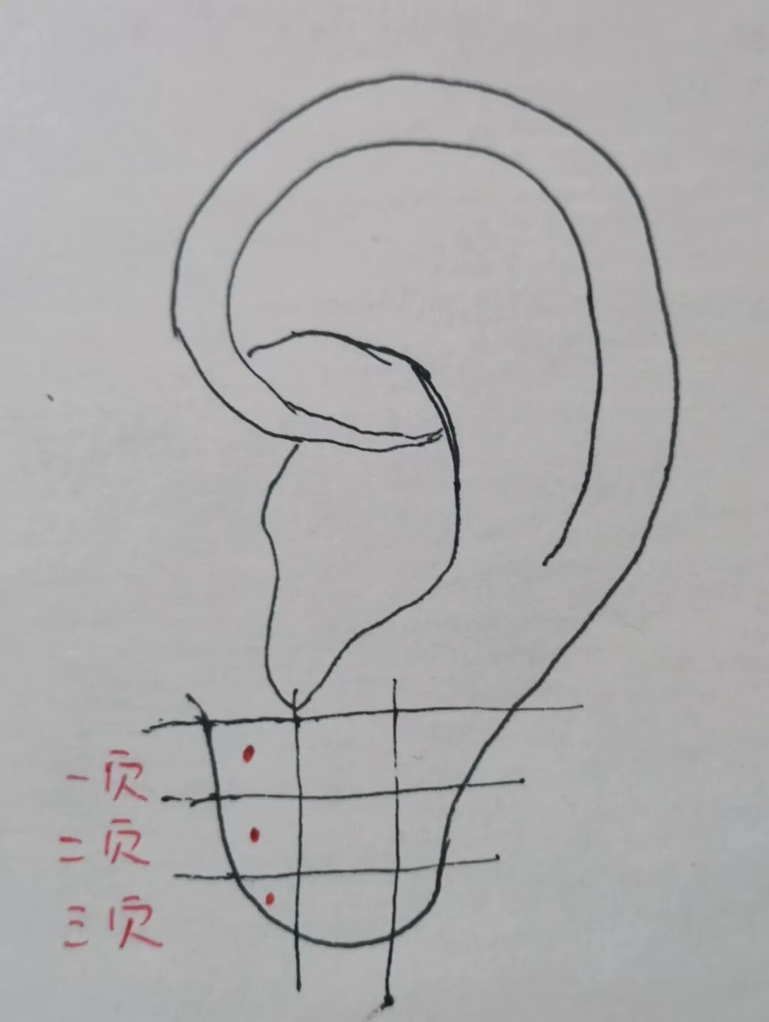在耳垂正面的内侧,耳垂上缘到耳垂下缘的最低点之间画两条平分线,在平分线上再画两条垂直等分线,这样耳垂就被分为9个区域,内侧靠近脸颊的一侧的三个区域,为三叉神经点,主治三叉神经痛,一共三个穴位。
