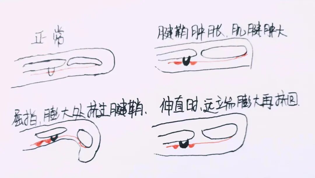 肌腱在已经狭窄的腱鞘内滑动,那必然会滑动困难的,而这时候我们还在使用拇指,肌腱在狭窄的腱鞘内活动,中间会逐渐变细,两端膨大。因此,用力屈伸拇指的时候,两端膨大的肌腱会经过狭窄的腱鞘,遇到暂时性梗阻,手指屈伸不利,如果我们强行通过,还会产生弹响。