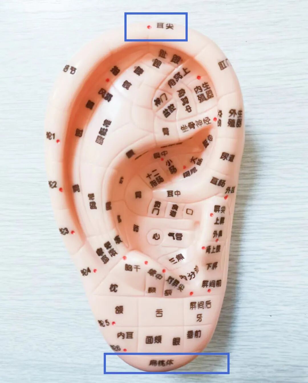 “耳者,宗脉之所聚也”,耳尖位于耳郭最顶端,刺血可解热、镇静、消炎、止痛。耳尖,耳朵向前对折的尖端就是耳尖,这个穴位放血没手指上的那么疼。