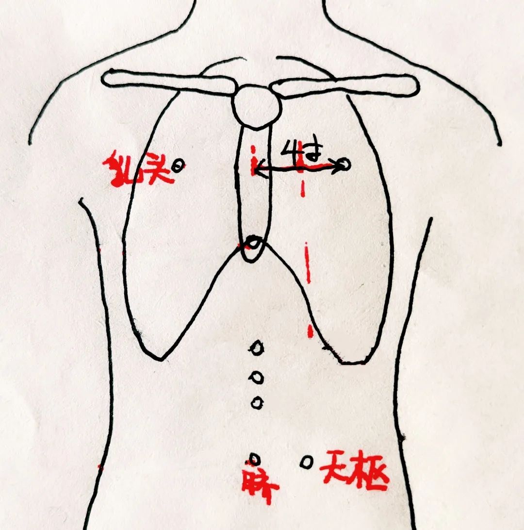 天枢在肚脐旁2寸。乳头和前正中线距离就是4寸,再一半就是2寸。
