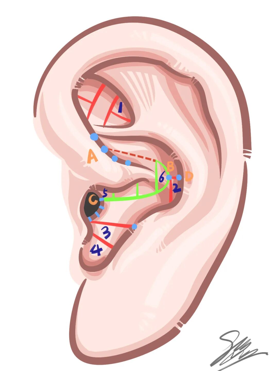 外耳门的最低点和对耳屏耳甲缘中点相连,将这条连线下的耳甲腔部分为上下两等份,上部是三焦,序号3,下部是内分泌,序号4。