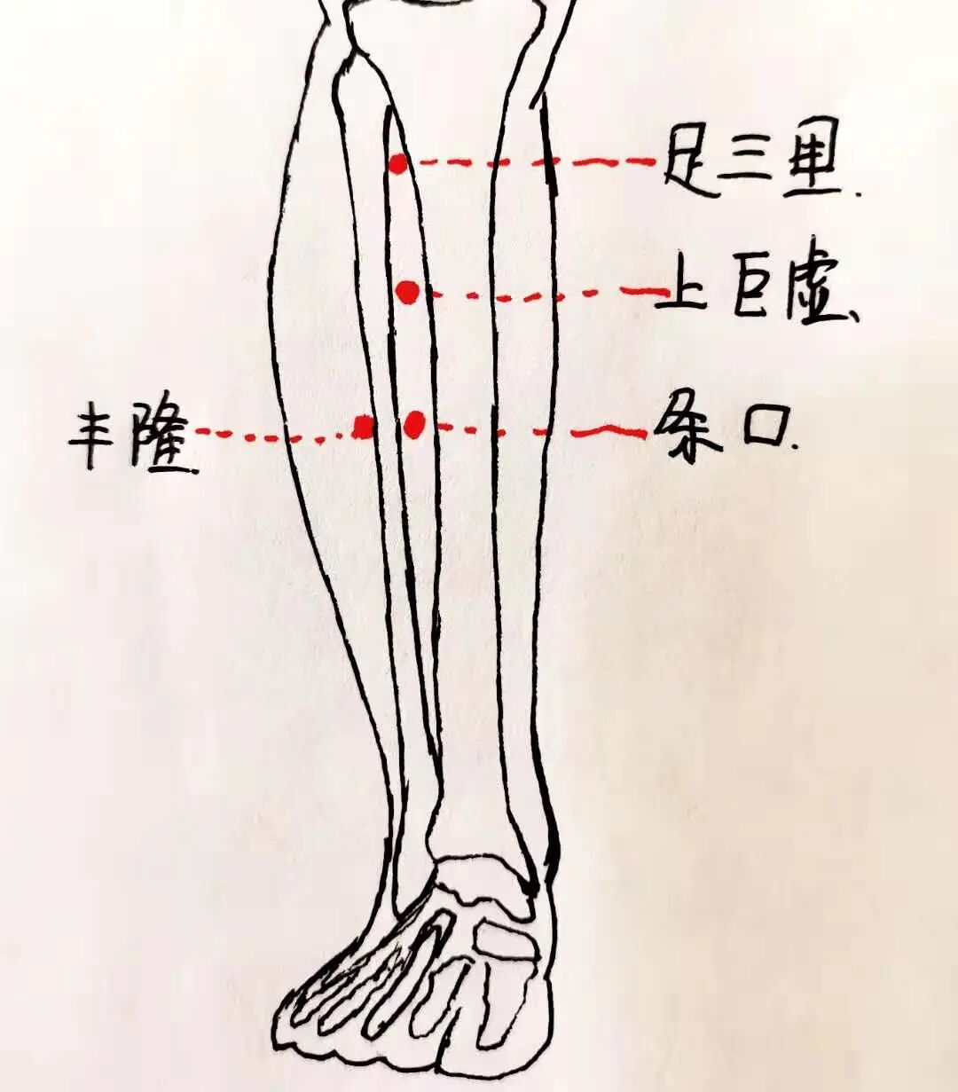 丰隆在小腿的前面偏靠外侧,外踝尖上8寸,距离胫骨前缘2横指(中指)。腘横纹和外踝尖的距离是16寸,一半就是8寸。