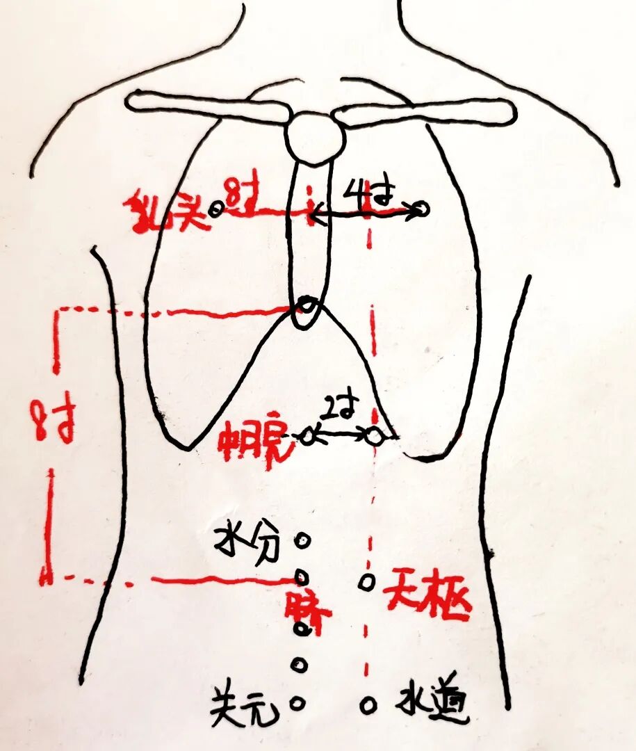 水道在下腹部,肚脐下3寸,前正中线旁开2寸。两乳头之间是8寸,乳头和前正中线距离就是4寸,再一半就是2寸。