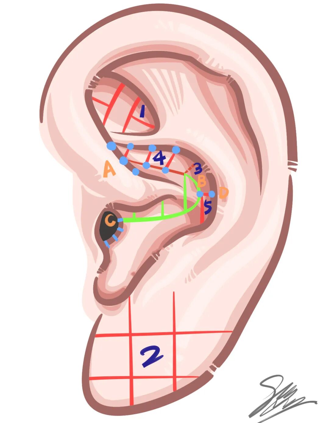 A点,在耳轮的内缘上,耳轮脚切迹和对耳轮下脚之间中上1/3交点。耳轮脚切迹在耳轮脚棘前方的凹陷处。呈Y字型的隆起是对耳轮,分为对耳轮体,对耳轮上脚,对耳轮下脚。对耳轮下脚必然就是下面的小分支。