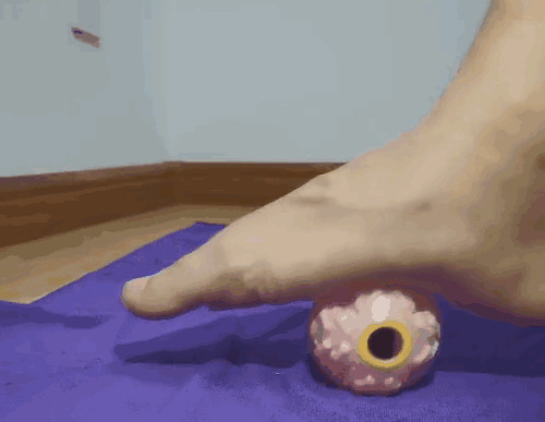 扶墙站立,将疼痛的那只脚脱去鞋袜,光着脚把一只网球踩在地上,用网球抵住脚底的痛点,围着痛点缓缓挪动,要能感觉到酸痛但是又没有刺痛。然后再用整个脚掌前后滚动网球。每次踩1分钟左右,连续3次,这样既是对损伤的部位给予良性的刺激,促进损伤部位的恢复,同时还能充分舒展足底。(注:半夏家没有网球,只能用狗的玩具球代替,给大家示范一下,大家不要用这种球,不光滑,硌得慌。)