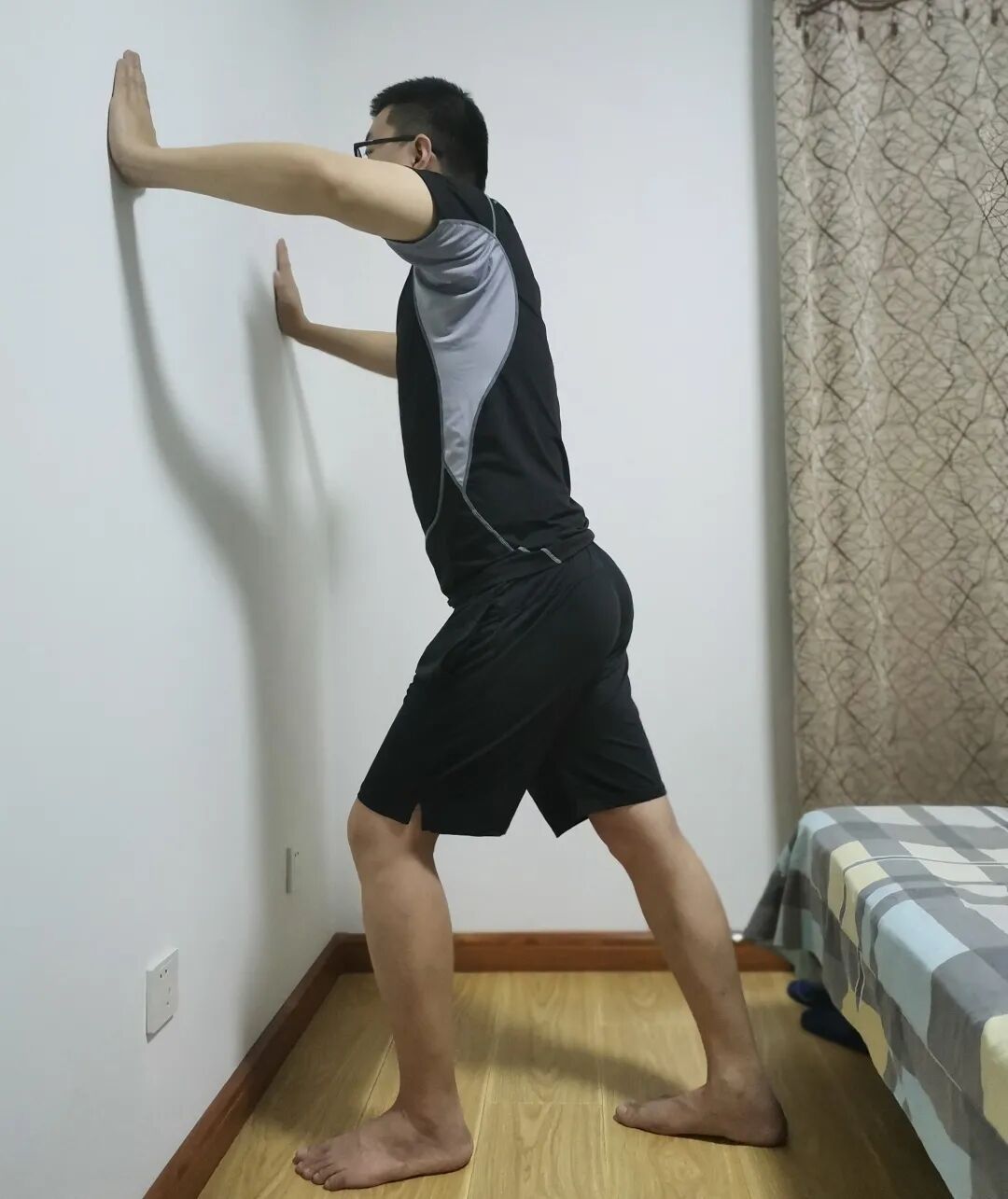 脸朝着墙站立,把疼痛的那条腿尽量向后伸,前腿膝盖弯曲,双手向前举和肩膀相平,身体前倾,双手推墙,会有小腿的牵拉绷紧感。这个过程中尽量保持后腿伸直,脚跟不离地。以自己能耐受为度。维持20~30s,重复10~15次。在逐渐的锻炼中,当感觉紧张牵拉感逐渐减少的时候,可以增加身体前倾的程度,维持小腿后方的紧张牵拉感。