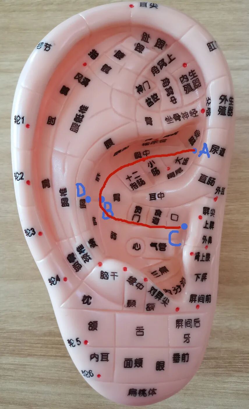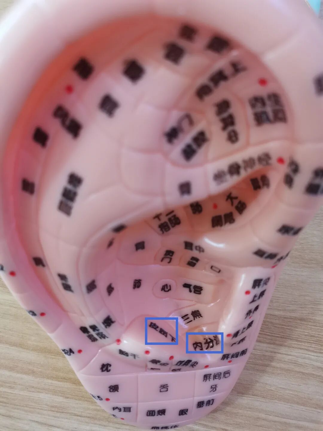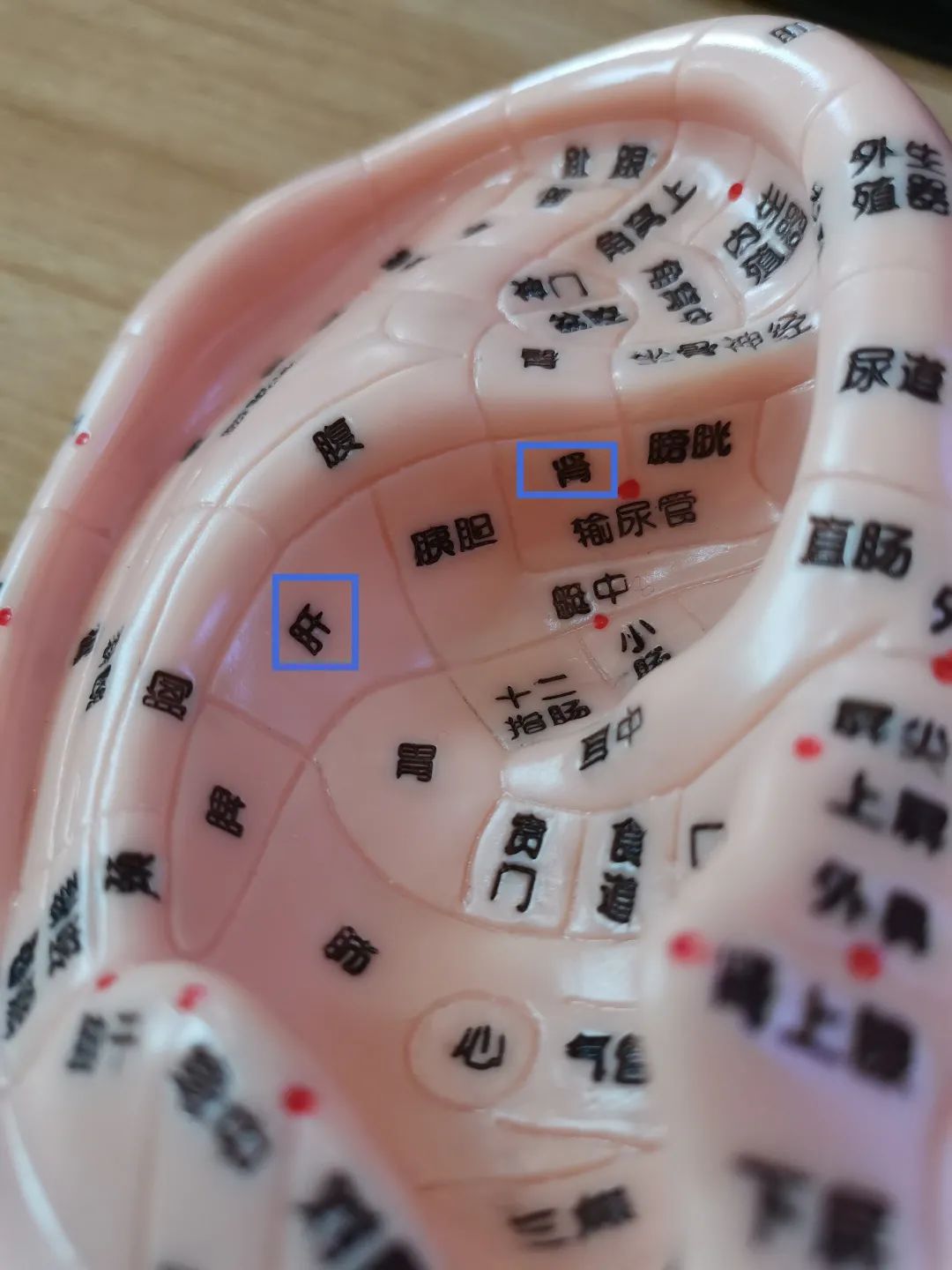 肾,在对耳轮下脚下方后部。AB线前半段的上方,对耳轮下脚分成三等份,后三分之二和AB线之间分成前后两等份,后半分就是肾。