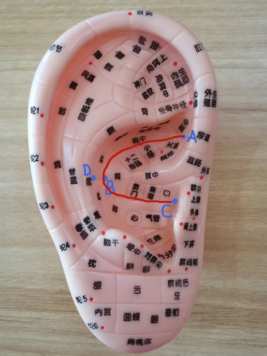 A点,在耳轮的内缘上,耳轮脚切迹和对耳轮下脚之间中上1/3交点。耳轮脚切迹在耳轮脚棘前方的凹陷处。呈Y字型的隆起是对耳轮,分为对耳轮体,对耳轮上脚,对耳轮下脚。对耳轮下脚必然就是下面的小分支。