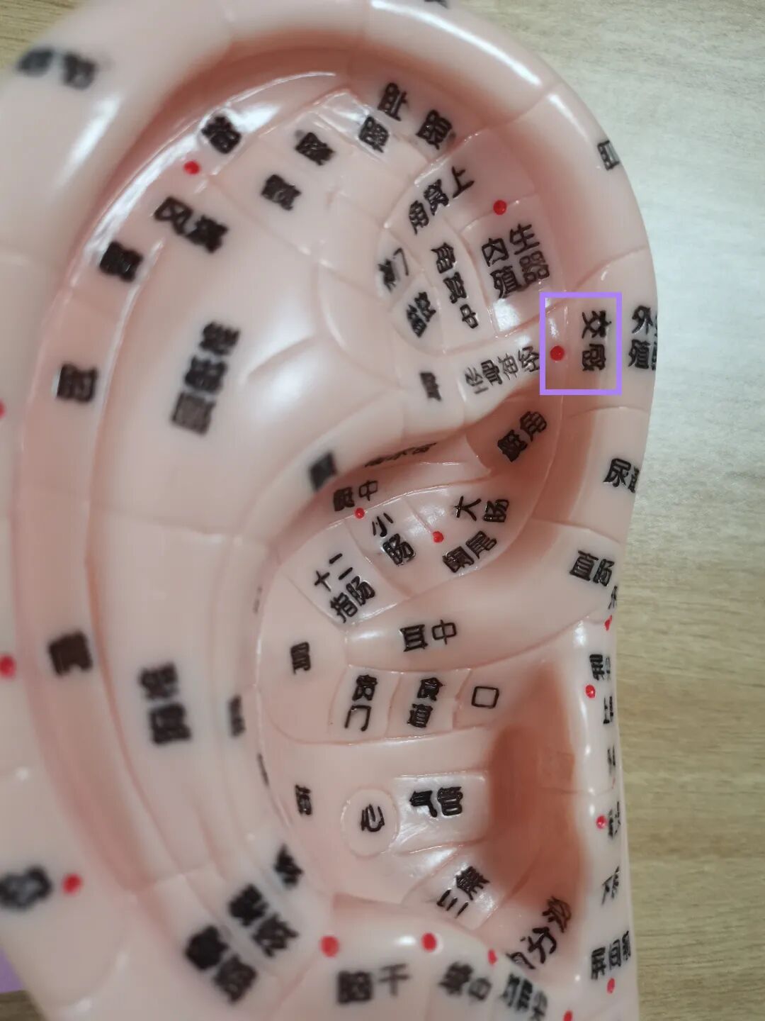交感,对耳轮下脚最前端和耳轮内缘的交界处。