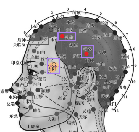 侧头痛:太阳、风池、行间、侠溪、率谷、外关