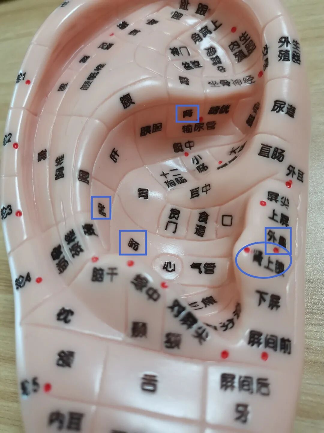 肾上腺,耳屏外侧面分为上下2等份,上部是耳屏1区,下部是耳屏2区,肾上腺在2区游离缘的尖端。