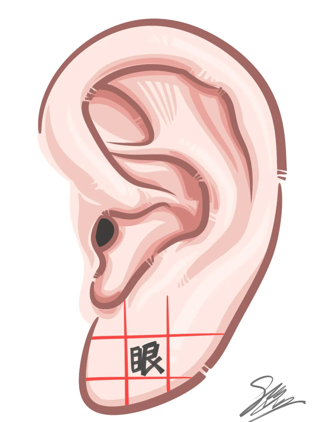 眼,在耳垂正面中央。取法,耳垂上线到耳垂下缘的最低点之间画两条平分线,在平分线上再画两条垂直等分线,这样耳垂就被分为9个区域,最中间的区域就是眼。