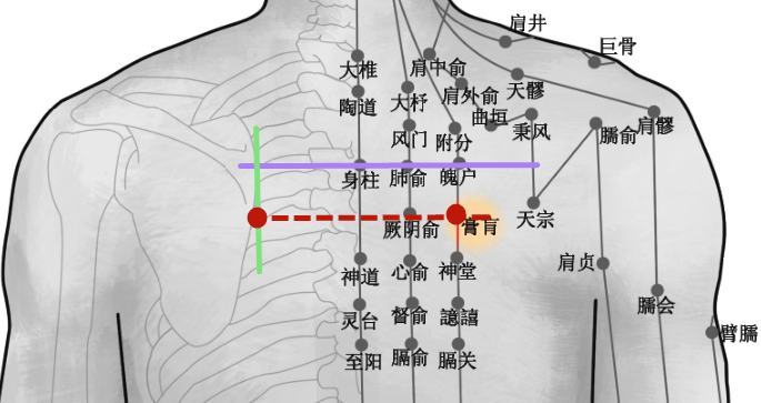 取法,需要先找到肩胛骨,然后在肩胛骨上找到横向走行的肩胛冈,肩胛冈平第三胸椎,向下一个胸椎的棘突下,靠近两侧肩胛骨内侧缘处就是膏肓穴,共2个膏肓穴。