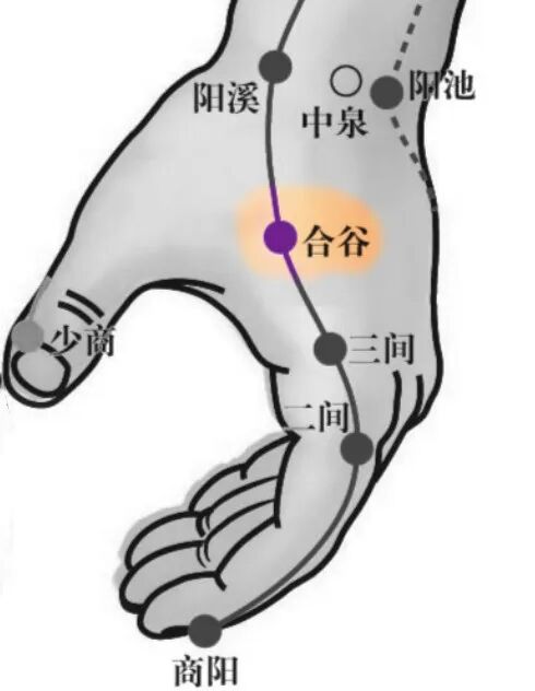 ♥合谷,在手背,第1、2掌骨间,当第二掌骨桡侧缘的中点处。或以一手的拇指指骨关节横纹,放在另一手拇、食指之间的指蹼缘上,当拇指尖下是穴。大肠经的原穴。
