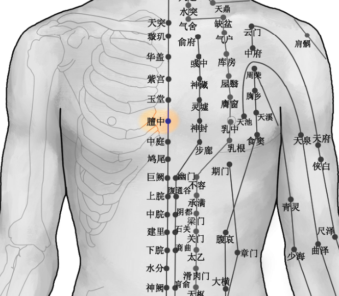 ♥膻中,在胸部,前正中线上,平第四肋间隙,两乳头连线的中点,具有宽胸理气的作用。心包募穴,募穴是脏腑气机集聚在胸腹部的穴位,五脏六腑各有一个募穴,募穴偏于祛邪泻实,通调脏腑。脏腑有病变的时候多数都会在相应的募穴出现疼痛等反应。膻中为八会穴之气会——气会膻中,为宗气之所聚。膻中功效偏于理气,气海偏于补气,所以选用膻中。