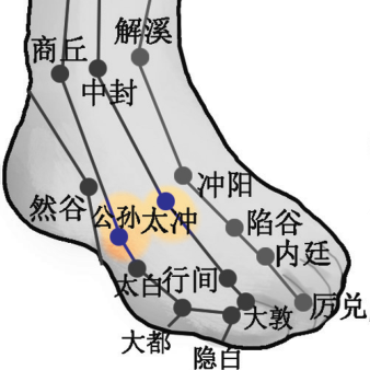 ♥太冲,在脚背上,足第一跖骨间隙的后方凹陷处。为肝经的输穴和原穴,具有调理气血,平肝熄风的作 用。《灵枢》指出“五脏六腑之有疾者,皆取其原也”,所以肝经的原穴——太冲,治疗肝经病变。
