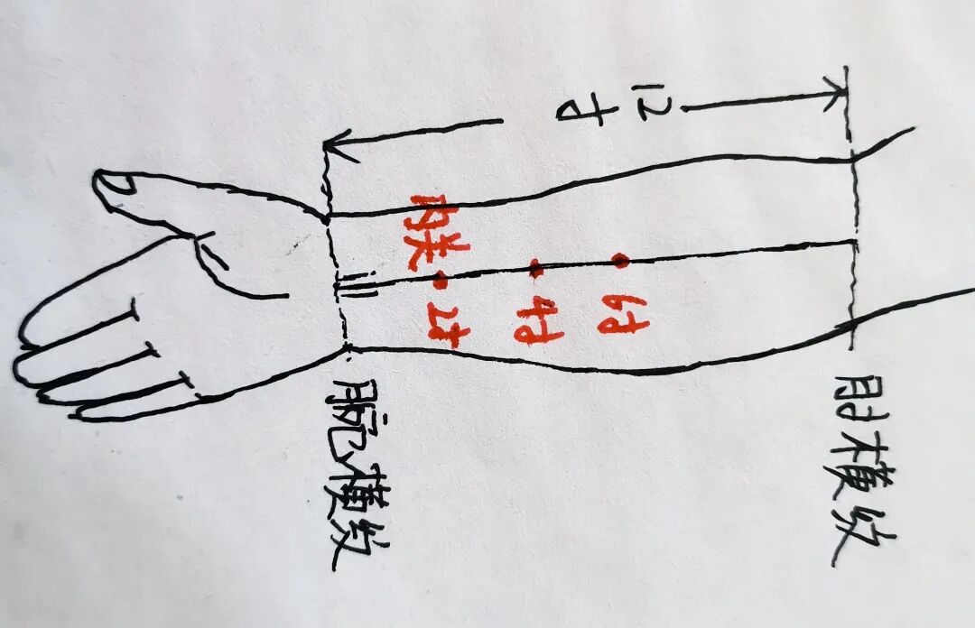腕横纹上2寸的确定方法。腕横纹和肘横纹之间的距离是12寸,取中线,每份6寸。下6寸再平分成3分,这样2寸的位置就确定了。
