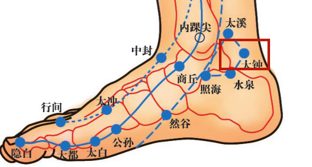 跟腱拉伤的必选穴,是因为大钟穴在跟腱附着部的内侧前方凹陷处,正在病灶上,刺激大钟穴,直达病所。