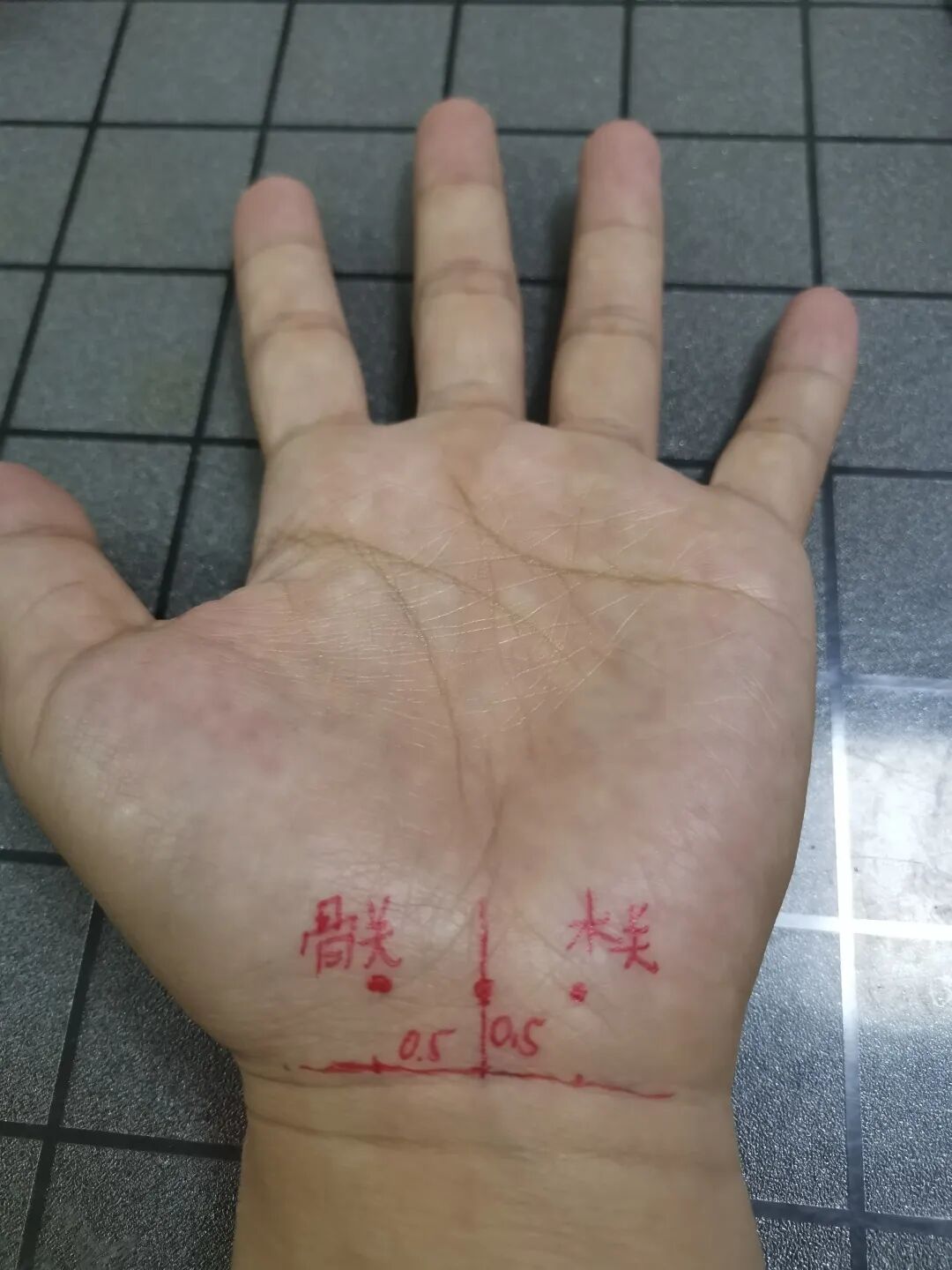 骨关穴:手掌面,腕横纹正中央下五分偏桡侧五分处,即食指与中指叉口直上至腕横纹再下五分处。