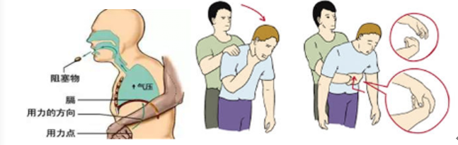 另一手成掌捂按在拳头之上,双手急速用力向里向上挤压,反复实施,直至阻塞物吐出为止。