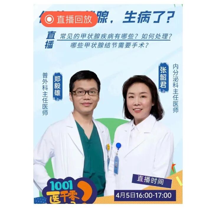 4月5日,甲状腺外科中心郑毅雄主任医师和内分泌科副主任张韶君主任医师一起坐客浙大四院《医千零一问》视频直播间,为广大网友直播讲解常见甲状腺疾病和治疗,以及甲状腺结节的相关问题。