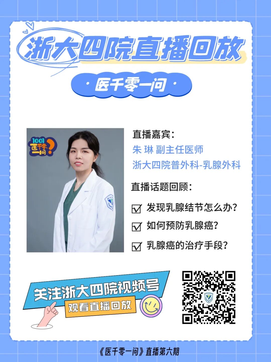 期间,浙大四院乳腺外科副主任医师朱琳参与浙大四院《医千零一问》直播间第六期节目录制,为大家带去了乳腺疾病的科普。