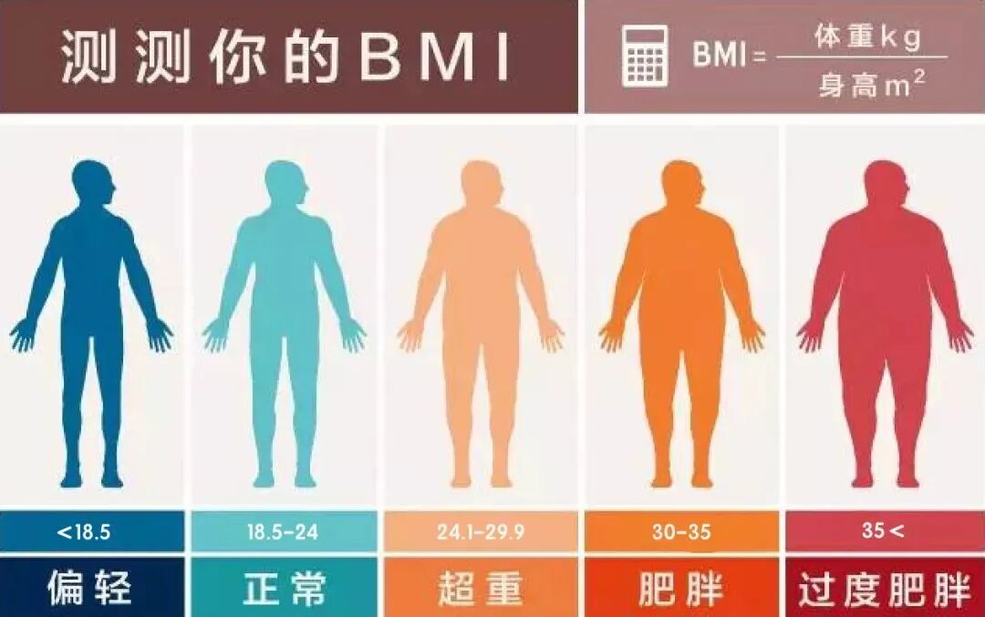 临床通常以体重指数(BMI)为诊断标准:BMI(kg/㎡)=体重(kg)/身高2(㎡),我国采用的标准是: